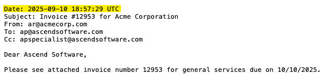 You asked and we listened! Documents sent to an Ascend AP inbox that’s set up include the email on the last page now also show the date and time Ascend AP received the email. The timestamp is in UTC in the top left corner of the last page, above the email message.