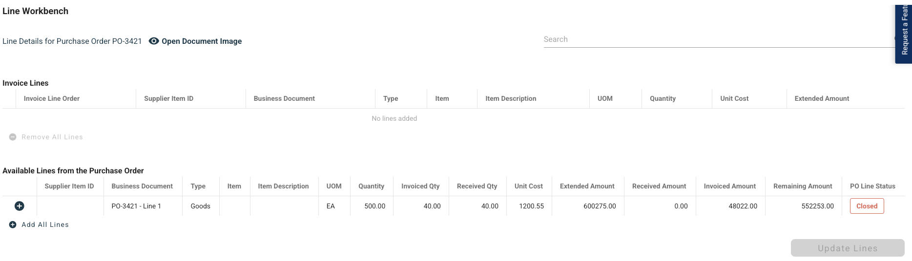 Thanks to your feedback about the Line Work Bench, there’s now a PO Line Status that shows whether a line is open, closed, or waiting for payment. There are also five new fields that show, depending on the type of invoice line:
